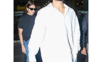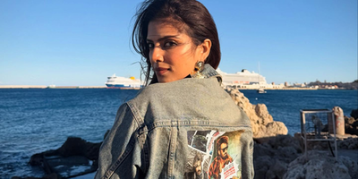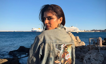 After director Maruthi, actress Malavika Mohanan now sports outfit bearing 'The Raja Saab' poster in Greece