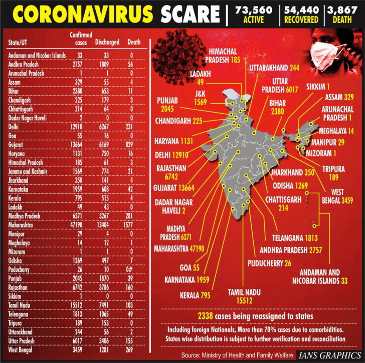 Of the total cases, 73,560 are active whereas 3,867 people lost their lives to the highly contagious disease. A total of 54,441 people have been cured so far, including 2,658 in the last 24 hours.