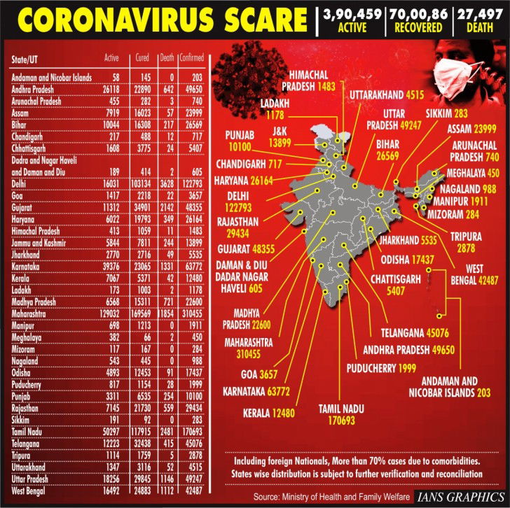 Karnataka, the new hotspot state, is nearing 65,000 cases, as Maharashtra remained the worst-hit state, with 3,10,455 cases and 11,854 casualties followed by Tamil Nadu with total 1,70,693 cases, and 2,481 deaths.