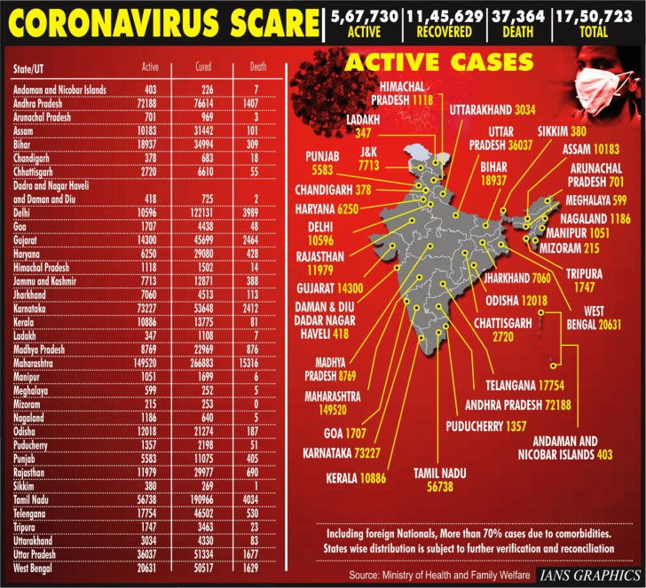 Out of the total 17,50,723 cases, 5,67,730 cases were active, 11,45,629 people recovered from the disease and were discharged, while 37,364 persons have lost their lives in the fight against the deadly virus.