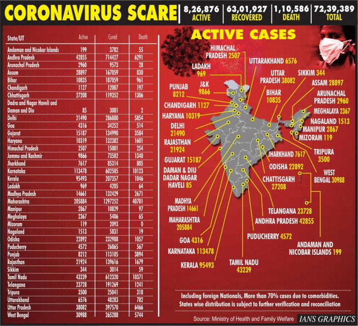 Three states account for maximum caseload in the country -- besides Maharashtra which continues to be the worst-hit with a total of 15,43,837 cases including 40,701 deaths; it is Karnataka and Kerala. In fact Kerala, which till two weeks back, did not feature in the top list -- is now in the third spot.