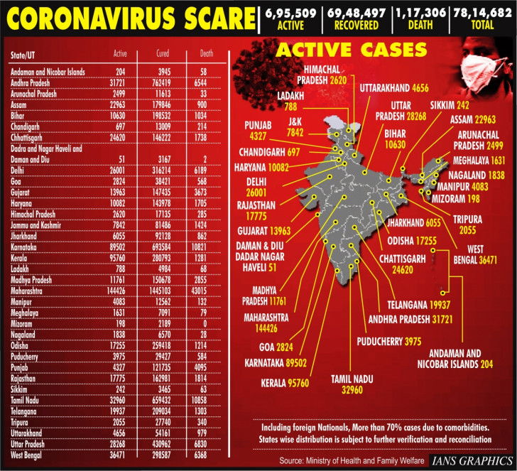 Maharashtra continues to be the worst-hit with a total of 16,25,197 cases, including 42,831 deaths; followed by Andhra Pradesh, Karnataka, Tamil Nadu, Uttar Pradesh and Delhi.