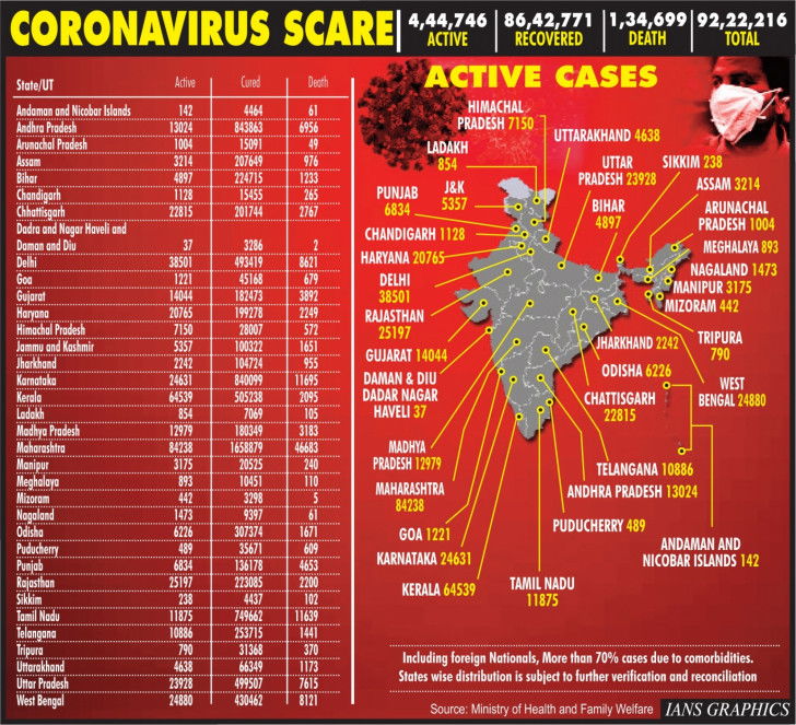 Maharashtra remains the worst hit state with 84,238 active cases and 46,683 deaths so far. The recoveries in the state stand at 16,58,879.