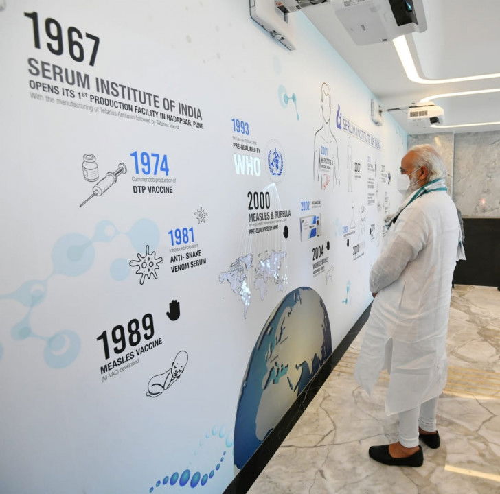 "Had a good interaction with the team at Serum Institute of India. They shared details about their progress so far on how they plan to further ramp up vaccine manufacturing. Also took a look at their manufacturing facility," Modi tweeted after his visit, and shared pictures.