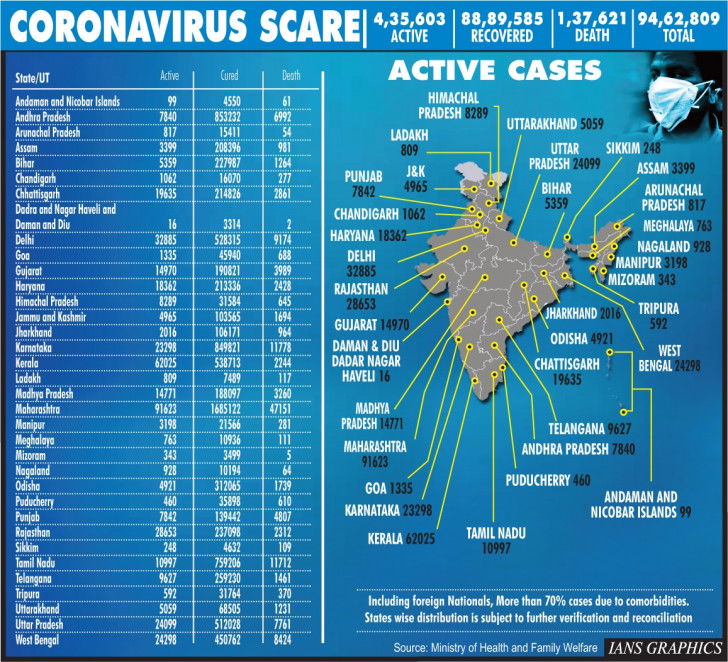 Maharashtra continued to be the worst-hit state with 18,23,896 cases till date. There are 91,623 active cases and 47,151 Covid-19 deaths.