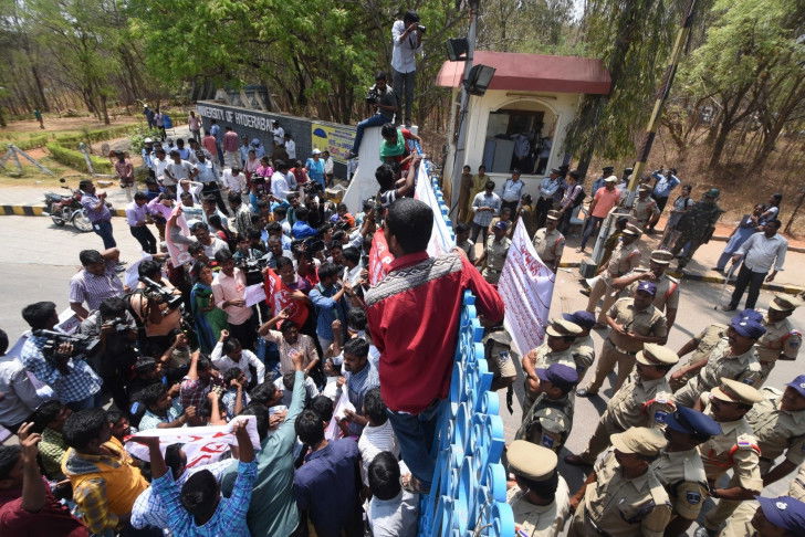 The Hyderabad police detained the protesting students and took them to R.C. Puram police station. Wildlife activist and state Akhil Bharatiya Vidyarthi Parishad co-convenor Rohit Bondugula told IANS that he along with 14 other students were detained by the police.