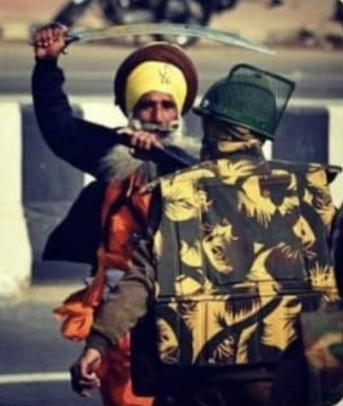 New Delhi, Jan 28: He stood firm and looked straight in the eye of the old man in a turban who raised his sword above his head, ready to strike him, at the NH-24 on January 26. Delhi Police Sub-Inspector Dayachand's photo went viral where he is seen facing an angry protester with a raised sword.