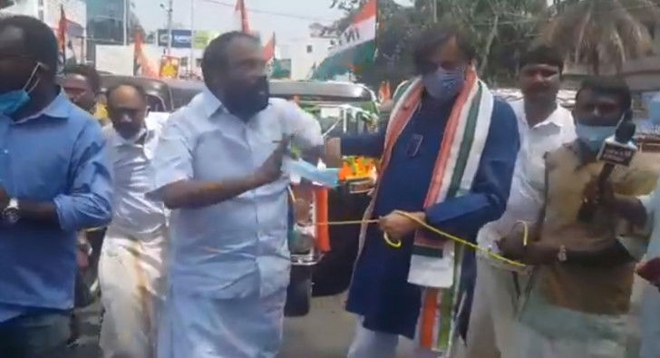 Tharoor took to the streets in his constituency and led hundreds of auto rickshaw drivers. He symbolically pulled a three-wheeler with a rope to express protest against the soaring petrol and diesel prices.