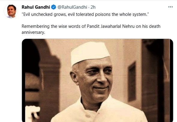 "Evil unchecked grows, evil tolerated poisons the whole system. Remembering the wise words of Pandit Jawaharlal Nehru on his death anniversary," he said in a tweet.