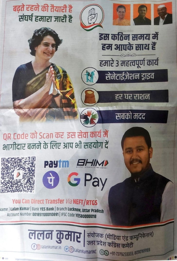 In a donation appeal, published as an advertisement in a local newspaper, Lalan Kumar has put photographs of party interim president Sonia Gandhi, MP Rahul Gandhi, state in-charge Priyanka Gandhi Vadra and state president Ajay Kumar Lallu.