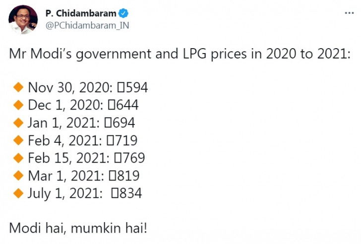 He further stated how the prices have risen, "Mr Modi's government and LPG prices in 2020 to 2021, from Rs 594 in November 2020 to price as of July 1, 2021 Rs 834."
