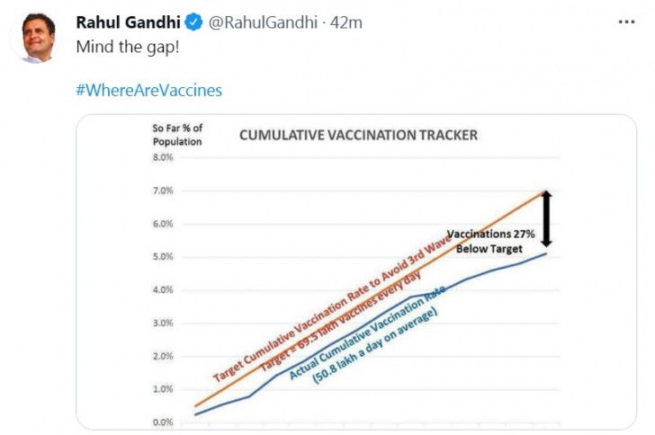 New Delhi, July 3 Former Congress president Rahul Gandhi on Saturday once again targeted the government over its vaccination policy, saying "mind the gap".