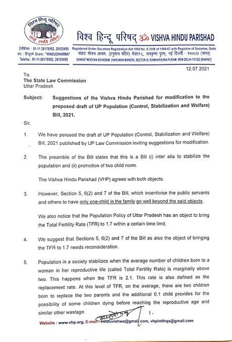 The VHP further sought attention towards Total Fertility Rate (TFR) mentioned in the document, saying the Bill has an objective to bring it to 1.7.