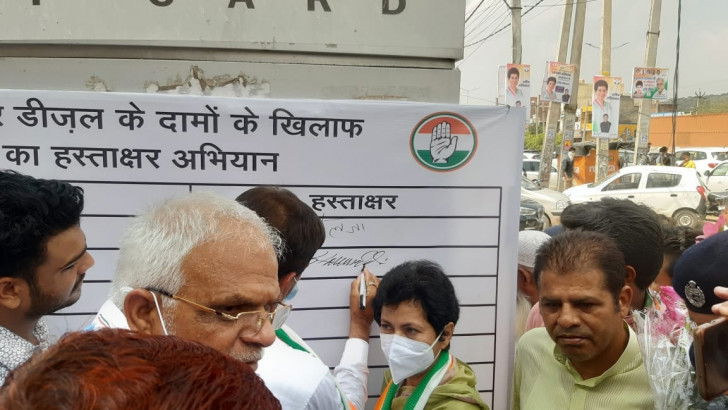 Gurugram, July 15 : Haryana Congress president Kumari Selja on Thursday launched a signature campaign at a petrol pump here to protest against the fuel price rise.