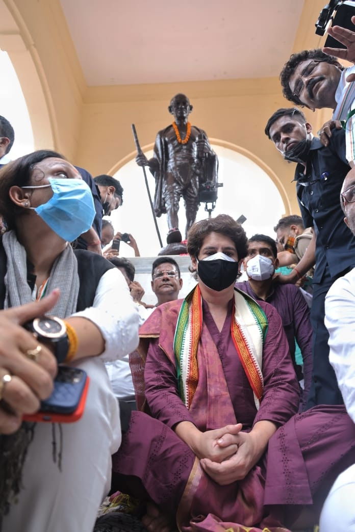 Priyanka, while on her way to the Congress headquarters here, stopped at the statue of Mahatma Gandhi to offer floral tributes.