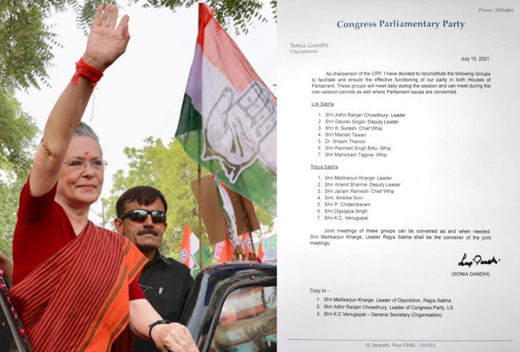 Sonia Gandhi, as Chairman of the Congress Parliamentary party, on July 15 issued a letter which said, "I have decided to reconstitute the following groups to facilitate and ensure effective functioning of our party in both houses of Parliament."