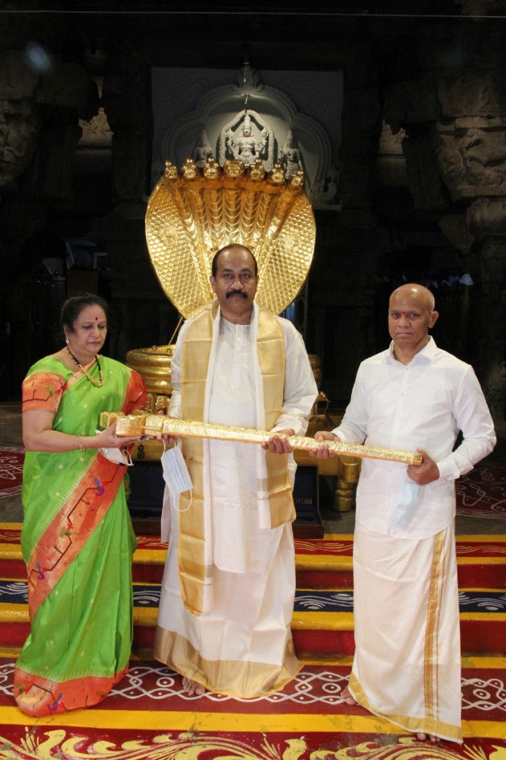 According to TTD officials, the sword, weighing 5 kg, was crafted with 2 kg of gold and 3 kg silver.