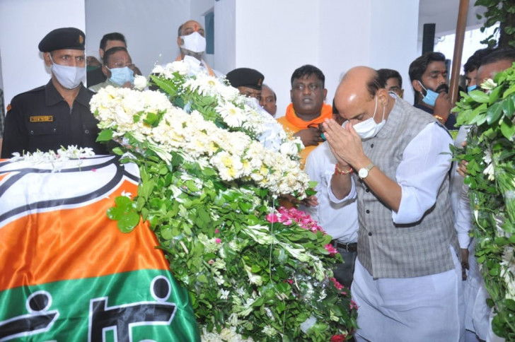 Union Defence Minister Rajnath Singh arrived in Lucknow on Sunday and offered tributes to late Kalyan Singh at the latter's residence.