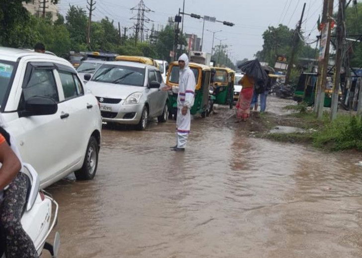 "Traffic alert: waterlogging has been reported at Basai Road. Our officials are on the spot to facilitate traffic flow. Commuters are requested to plan their travel accordingly," the Traffic police tweeted.