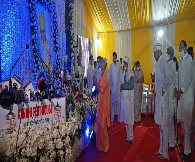 Yogi Adityanath reached Atrauli, where the ceremony was held, in the afternoon and touched the feet of Kalyan Singh's widow Ramwati Devi.
