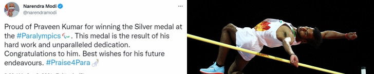 "Proud of Praveen Kumar for winning the Silver medal at the #Paralympics. This medal is the result of his hard work and unparalleled dedication. Congratulations to him. Best wishes for his future endeavours. #Praise4Para," PM Modi wrote on Twitter.