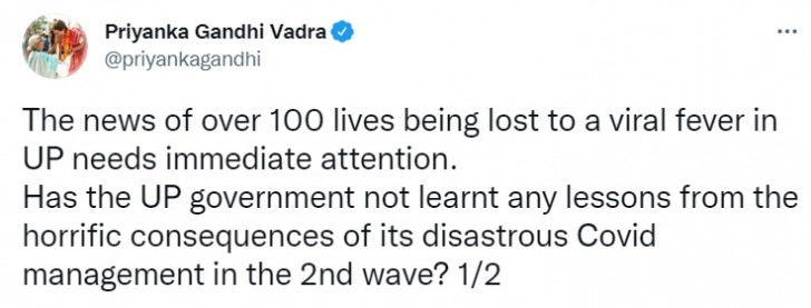 In a tweet, she said, "The news of over 100 lives being lost to a viral fever in UP needs immediate attention. Has the UP government not learnt any lessons from the horrific consequences of its disastrous Covid management in the 2nd wave?"