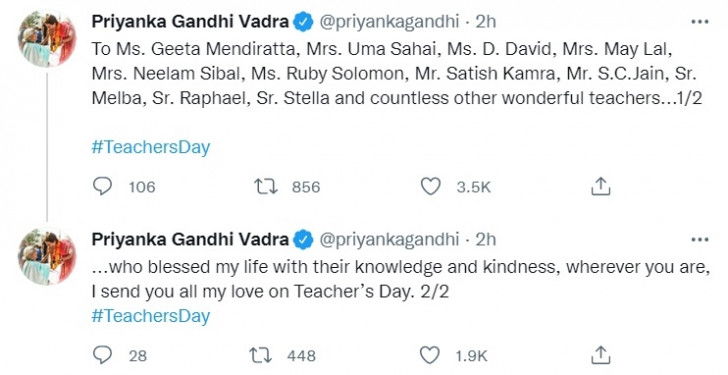 New Delhi, Sep 5 On the occasion of the Teachers' Day on Sunday, Congress General Secretary Priyanka Gandhi Vadra remembered her teachers and sent best wishes to them on this day.