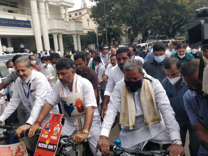 The bicycle ride began from the party headquarters in the city. State Congress President D.K. Shivakumar and Opposition leader Siddaramaiah rode bicycles and led a huge group to reach Legislative Assembly.