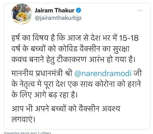 Shimla, Jan 3 : Himachal Pradesh Chief Minister Jai Ram Thakur on Monday launched the statewide Covid-19 vaccination campaign for children in the 15-18 age group from the Government Vijay Senior Secondary School (Boys) in Mandi town.