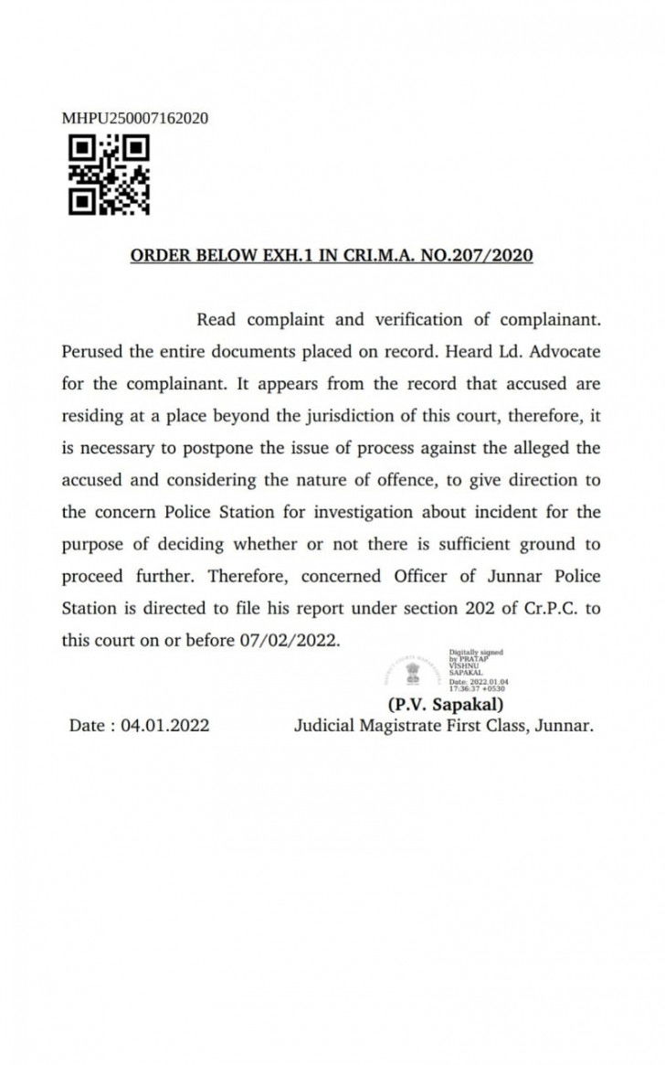 He directed the Junnar Police Station to conduct a probe under the CrPC's Section 202 and submit its report to the court by February 7, said Kurhe's lawyer Asim Sarode.