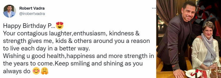 Taking to Twitter, her husband Robert Vadra wrote: "Happy Birthday P