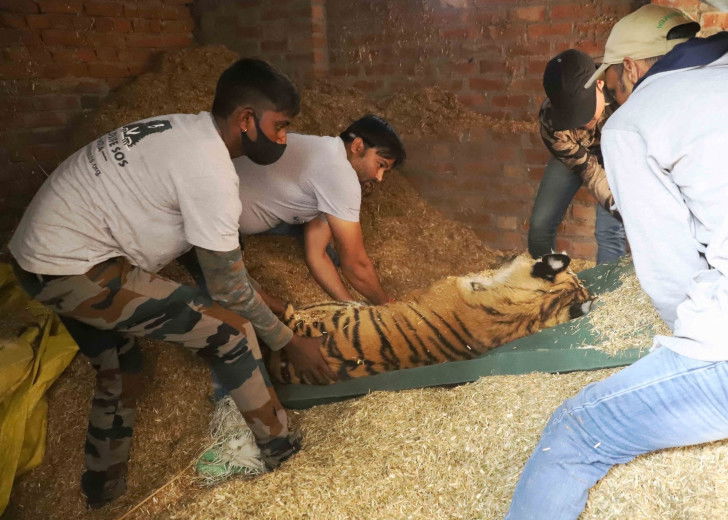 Bricks from the shed wall were removed to tranquilise the animal from a safe distance and the tigress was swiftly immobilised. Following all safety protocols, the tigress was carefully shifted into a transportation cage. A medical examination revealed that the tigress had sustained a minor injury on tail. "Once stabilized and given the on-site necessary treatment, the tigress was transported to Etawah Safari for further treatment," a release from the Wildlife SOS said.