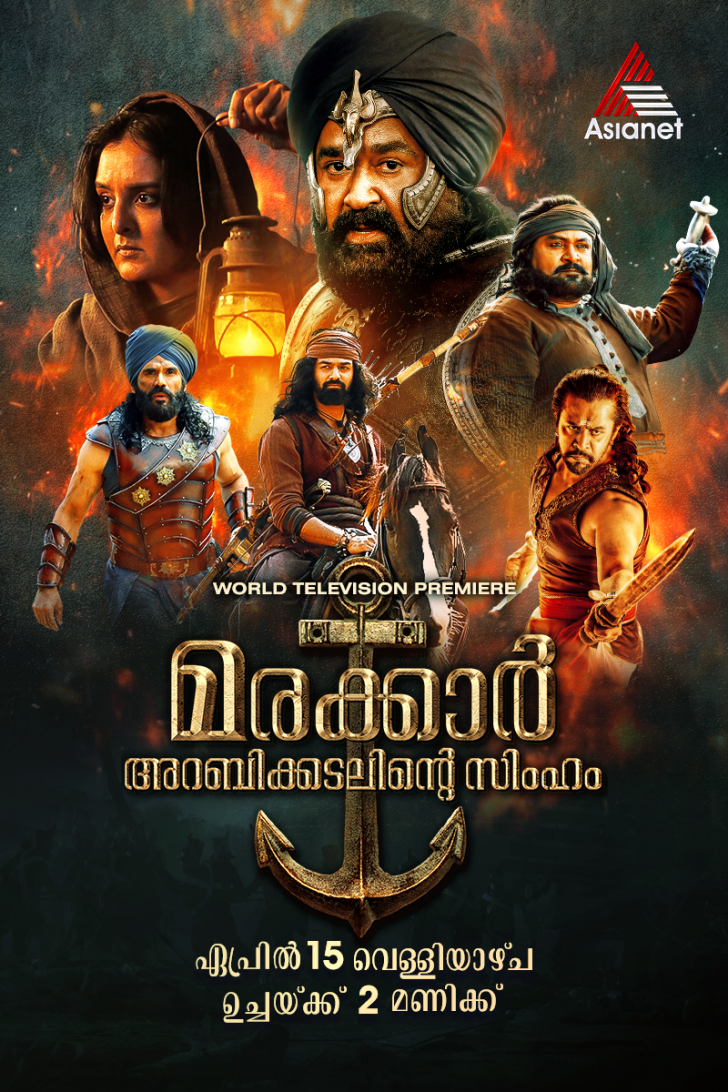 " Marakkar: Arabikadalinte Simham " tells the story of Kunjali Marakkar IV, Muhammad Ali , the lion of the Arabian sea. This movie shows Kunjali Marakkar IV, who fought against the Portuguese army as the Zamorin's commander, falling on the chessboard of the betrayal. Film directed by Priyadarshan and stars include Mohanlal , Prabhu, Arjun , Sunil Shetty , Manju Warrier , Keerthi Suresh and other leading artistes. " Marakkar: Arabikadalinte Simham " at 2PM on Friday 15th April 2022 ( Vishu Day ).