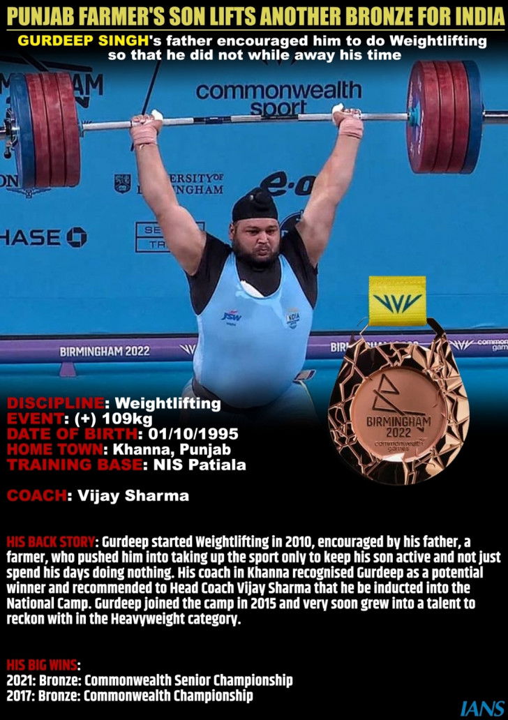 Birmingham, Aug 4 : India ended its campaign in the weightlifting competitions in the 2022 Commonwealth Games with super heavyweight lifter Gurdeep Singh bagging a bronze medal in Men's 109+ kg final.