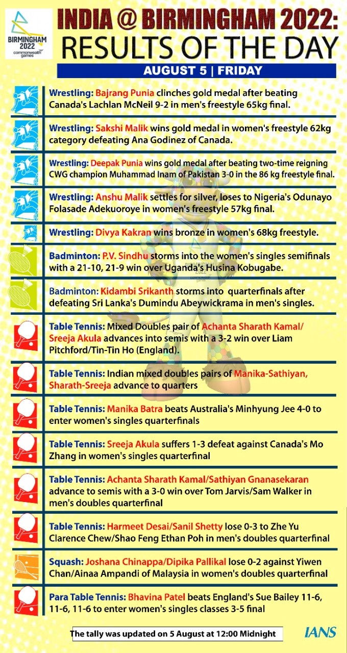 Birmingham, Aug 6 : Olympic bronze medallists Bajrang Punia and Sakshi Malik came up with authoritative wins and upcoming star Deepak Punia added a third gold to the country's Commonwealth Games tally as India asserted its supremacy on the wrestling mat to win six medals at the Victoria Park Arena at Coventry on Friday.