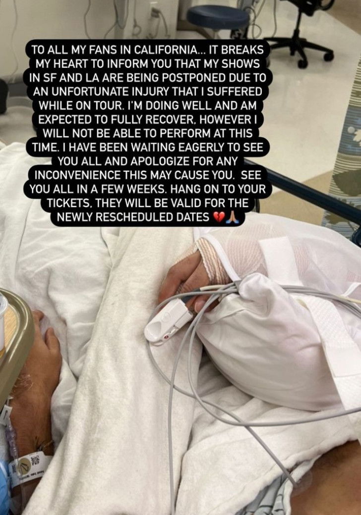 Dhillon wrote: "To all my fans in California. It breaks my heart to inform you that my shows in San Francisco and Los Angeles are being postponed due to an unfortunate injury that I suffered while on tour. I am doing well. And I am expected to fully recover."