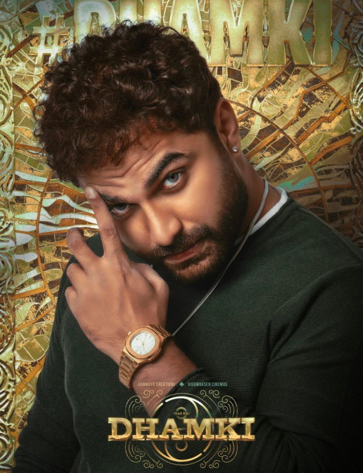 Raising his eyebrows in a threatening manner as if giving 'dhamki' (threat) to someone. The intriguing first-look poster indicates that Vishwak Sen is yet again playing a mass and action-packed character in the movie.