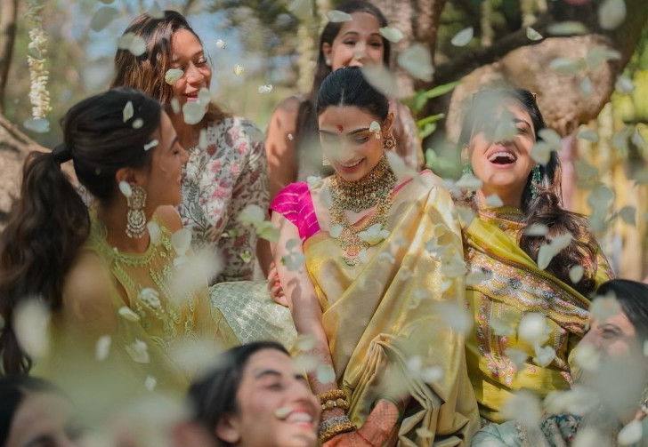 The first picture shows her smiling, while being surrounded by her female friends. The second image shows a pre-wedding ceremony in progress featuring Mana Shetty, who is seen performing a puja.