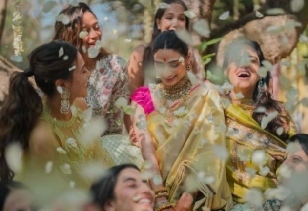 Bollywood actress Athiya Shetty on Saturday treated her fans to some unseen pictures from her pre-wedding ceremony dressed in a stunning golden saree with pink blouse and traditional polki jewellery.