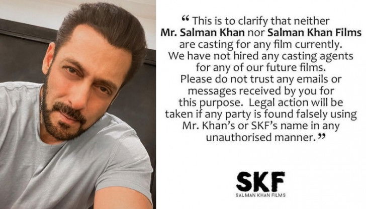 The notice read as follows: "This is to clarify that neither Mr Salman Khan nor Salman Khan Films are casting for any film currently. We have not hired any casting agents for any of our future films."