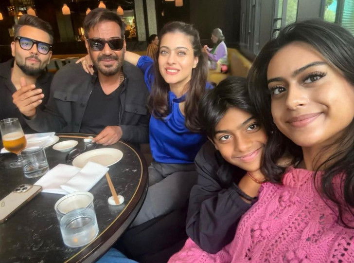 Nysa, who can be seen taking the selfie in a restaurant, shows Kajol in a blue satin top, paired with grey pants, with her hand wrapped around Ajay's shoulder. The latter can be seen wearing a black jacket and a similar tee, and Nysa donning a pink sweater.