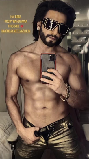 Ranveer, who will be seen as Rocky in 'RRKPK' took to Instagram Stories and shared a shirtless mirror selfie, wherein he can be seen flaunting his washboard abs. He is donning golden coloured pants, with a golden bracelet and black OG sunglasses.