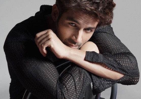 Taking to his social media, the 'Satyaprem Ki Katha' hero's enticing photo show him in a black mesh shirt, with his ever stylish hair, while he is sitting the other way round on a chair and rests his face on his crossed arms.