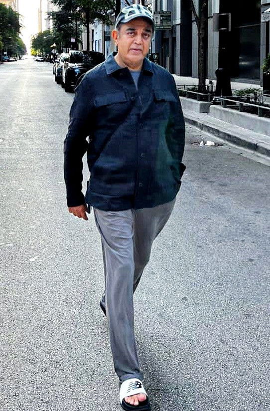 In the picture, the universal star Kamal Haasan can be seen walking on the streets wearing a pair of comfy pants, a jacket, a pair of sandals and a cap as he looks into the camera.