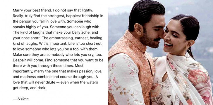 Bollywood actress Deepika Padukone recently took to her social media and shared a post about "marrying your best friend". She also tagged her husband Ranveer Singh in the post.