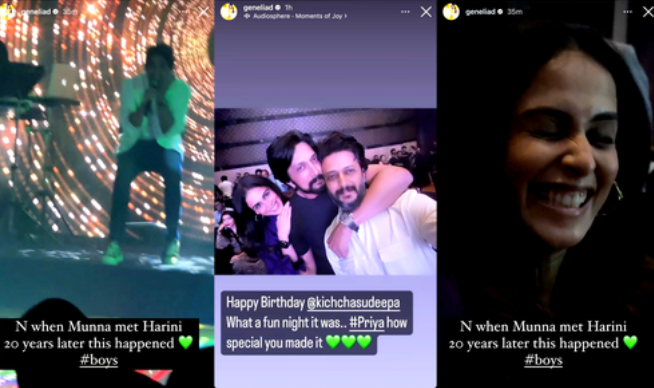 Actress Genelia D’Souza jetted off to Bengaluru. She wished actor Kiccha Sudeep on his birthday and even shared a glimpse of her ‘Boys’ co-star Siddharth while cheering for him as he was singing.