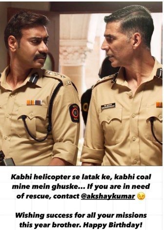 Ajay Devgn, who was earlier seen ‘Bholaa’, took to his Instagram Stories, and posted a fond message to his fellow ‘Khaaki’ actor, writing: “Kabhi helicopter se latak ke…Kabhi coal mine me ghus ke…If you are in need of rescue, contact@akshaykumarâ€