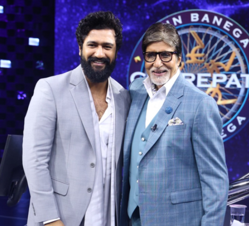 Host of the show Big B gives a flower to the 'Miss World 2017' Manushi. Vicky is seen shaking a leg on 'KBC 15', in the style of his character 'Bhajan Kumar' from the movie.