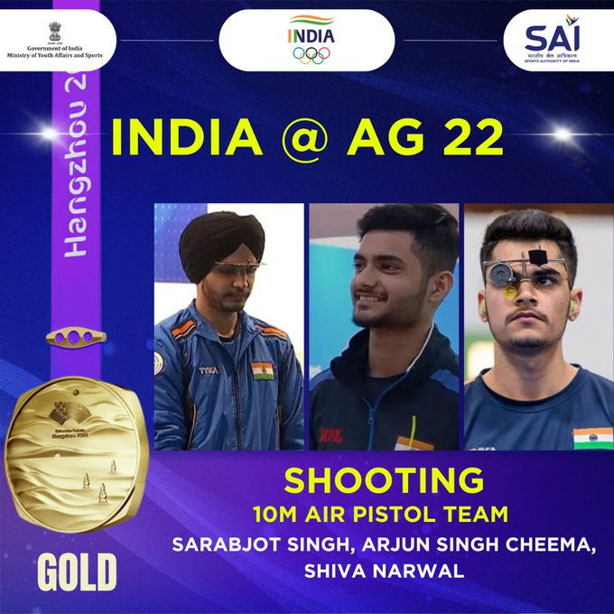 Sarabjot Singh, Arjun Singh Cheema and Shiva Narwal won a gold medal in the 10m Air Pistol Team shooting in the Asian Games on Thursday as India continued to reap in medals at the shooting ranges at the Fuyang Yinhu Sports Centre in Hangzhou.
