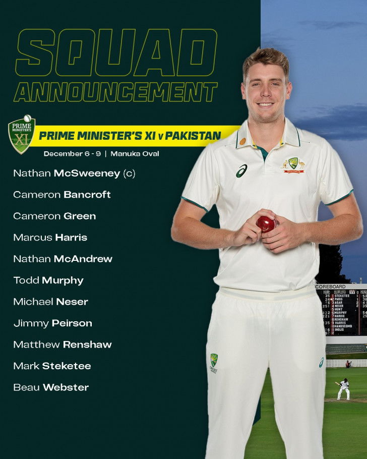 Prime Minister's XI squad: Nathan McSweeney (c), Cameron Bancroft, Cameron Green, Marcus Harris, Nathan McAndrew, Todd Murphy, Michael Neser, Jimmy Peirson, Matthew Renshaw, Mark Steketee, Beau Webster